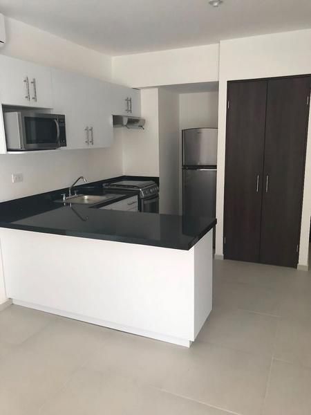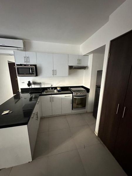 Área de sala comedor , con pisos y zócalos de porcelanato, cocina equipada con refrigerador, estufa, campana y microondas, centro de lavado, un cajón de estacionamiento, , seguridad 24 horas