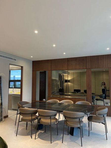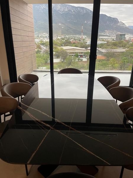 El departamento tiene un área social muy amplia con recibidor, sala, comedor, bar y terraza con vistas a la Sierra Madre y a la Huasteca. La cocina es cerrada con excelentes dimensiones, con isla y cubierta de cuarzo. La cocina está equipada con horno, microondas, lavavajilla, estufa y campana.