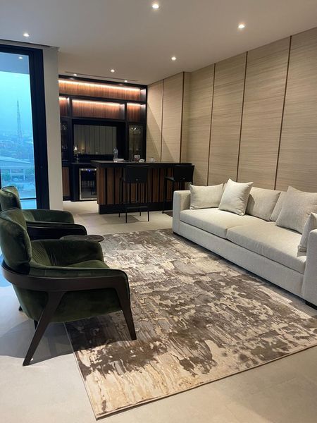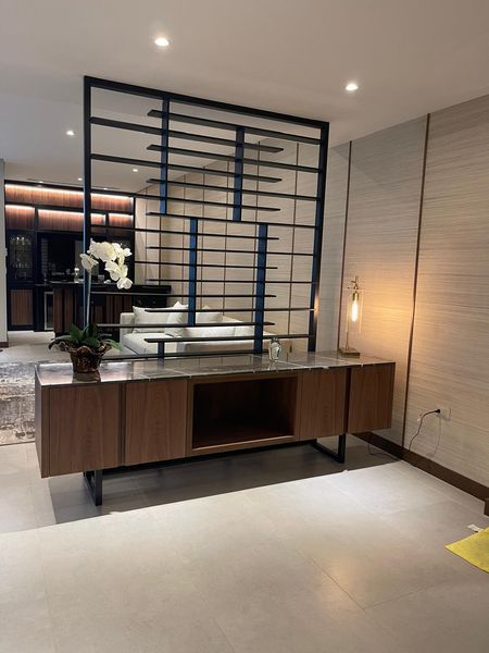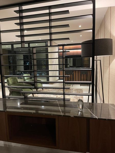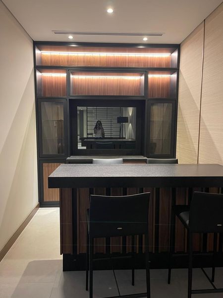 El departamento está equipado con muebles empotrados como bufetero, bar, muebles de tv y escritorio en recámaras, tapices, electrodomésticos y candiles.
