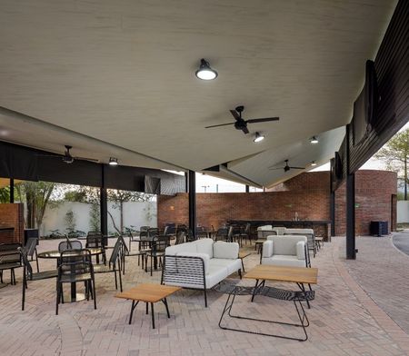 Amenidades exteriores: alberca, auditorio, centros culinarios.