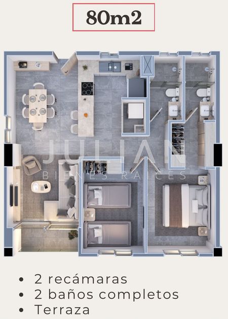 80 m2: 2 habitaciones y 2 baños completos y un balcón