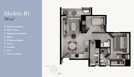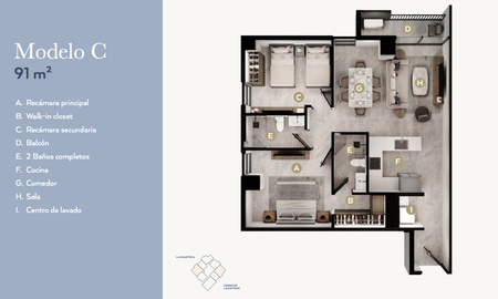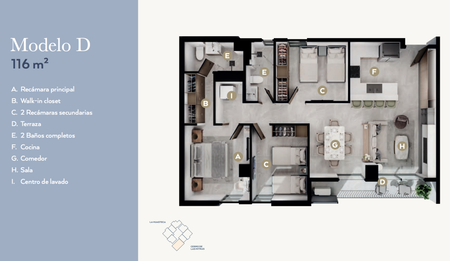 Desde 53 m2 hasta 116 m2. 110 deptos. Por torre, unidades desde 1,2 y 3 recámaras. 4 modelos de deptos. 6 a 8 unidades por nivel.