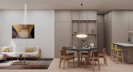 Tu nuevo hogar contará con pisos de porcelanato y zoclos de aluminio, creando un espacio único con el estilo excepcional del aclamado estudio de interiorismo Esrawe Studio.