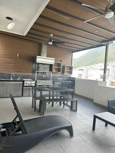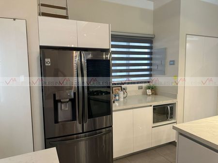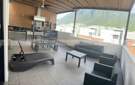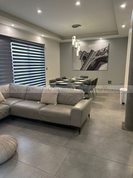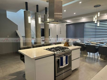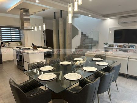 Hermosa residencia en la zona mejor ubicada y de mayor plusvalía al sur de Monterrey. Planta Baja: Sala-comedor, cocina con desayunador y área para despensa, baño de visitas, área de sink y cochera techada para dos autos Planta Alta: Recámara principal con vestidor y baño con doble lavabo, 2 recámaras con vestidor y baño completo, área de sink Terraza: Amplia terraza con área de asador, estancia con baño completo, lavandería y cuarto de servicio con baño completo. Incluye 3 mini splits de 3 toneladas ubicados en la sala, cuarto matrimonial y en la estancia dl tercer piso, y 2 minisplits de 2 toneladas en las otras 2 recamaras. Id Gvia: 117219