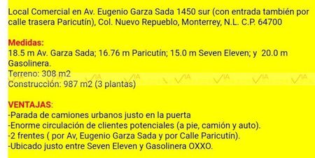 Ventajas: parada de camiones urbanos justo enfrente, enorme circulación de personas, dos frentes por Eugenio Garza Sada y Paricutín, super siete y gasolinera a media cuadra avenida principal cerca del centro y zona sur.