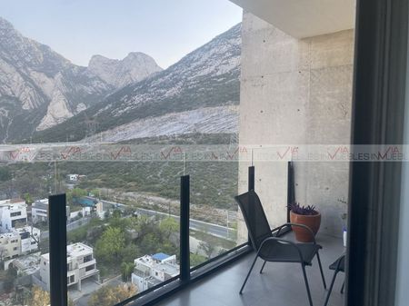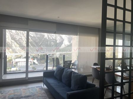 Hermoso departamento con balcón y vista a la huasteca de 112 mts2 cuenta con: Sala comedor muy amplia con mueble empotrado para TV. 1/2 baño para visitas 2 recamaras cada una con su baño completo, cocina integral con electrodomésticos y barra de granito, centro de lavado, minisplits en cada recamara, sala comedor y 2 cajones de estacionamiento.