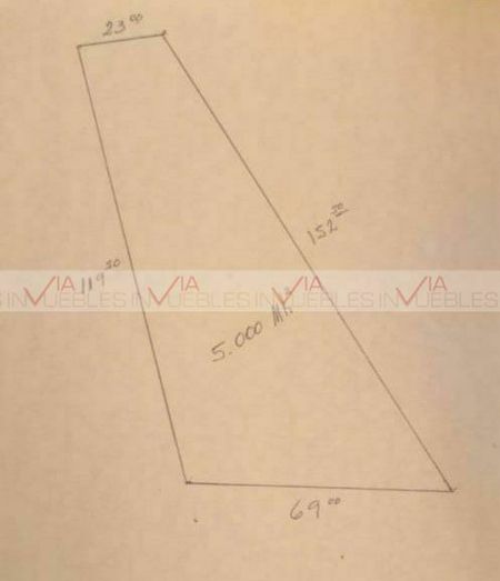 Terreno Residencial irregular de 5000mts. Cuenta con malla en todo el frente del terreno y mide 59.37 mts de frente. Los costados y fondos del terreno estan bardeados. Como el terreno es irregular, de un costado mide 152mts y el otro cuenta con 119.5mts y de fondo cuenta con 23.078mts. El terreno tiene una forma de casi un triangulo.