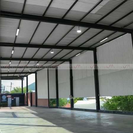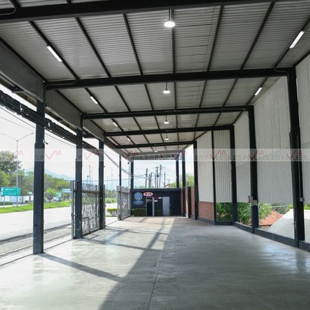 Terreno techado de 437 m², 44 metros de frente a carretera nacional, fondo de 12 metros, altura de 7 metros, cortinas eléctricas, cuarto de herramienta, mini oficina, 1 baño completo con regadera, luz 110 y 220 volts, portón eléctrico para acceso de vehículos