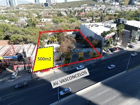 Excelente Terreno Comercial AAA en Renta, ubicado estratégicamente sobre una de las vialidades de más alto flujo vehicular en el Municipio de San Pedro, como lo es Av. Vasconcelos a escasos metros de Av. Ricardo Margain, en una zona comercial y de departamentos. El inmueble está ideal para desarrollar proyecto comercial. Superficie de 500m2 y Renta de $ 100,000. GS
