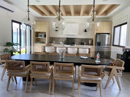 La casa es de dos plantas, en primer nivel se encuentra una amplia área de sala comedor con vista y acceso al jardín. Cocina integral completamente equipada y con isla de gran tamaño. También en planta baja hay un medio baño con hermosos acabados. En segunda planta se encuentra un estudio y la recámara principal con dos camas Queen y su baño completo. La casa incluye proyecto de expansión de 3 recámaras adicionales cada una con su baño completo.