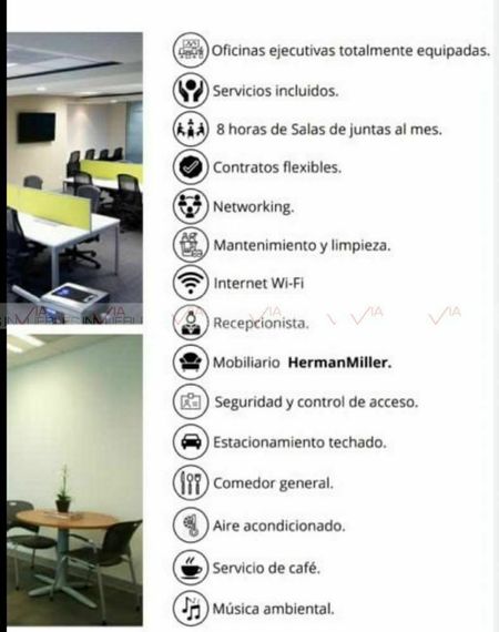 Incluye Servicios, 8 hrs de salas de juntas al mes, Networking, mantenimiento y limpieza, WiFi, Recepcionista, Mobiliario HermanMiller, Seguridad y control de acceso, estacionamiento techado, comedor general, aire acondiconado servicio de cafe y musica ambiental