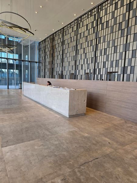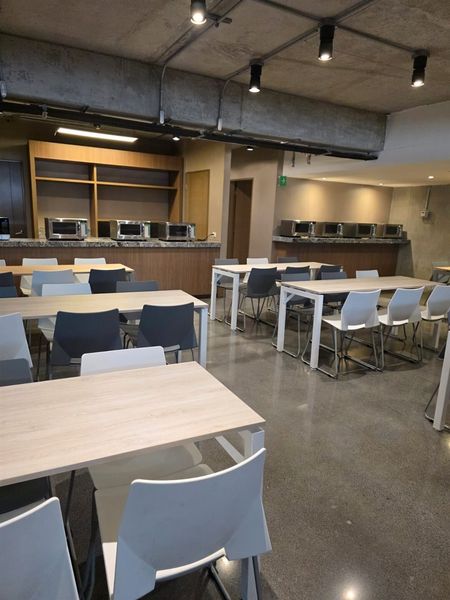 Lobby central con doble altura con cafeteria