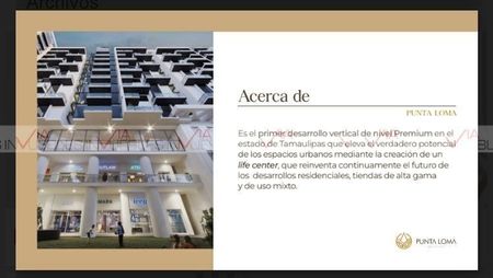 Punta Loma Life Center, primer desarrollo de usos mixtos en Tamaulipas, 1660 m2 de amenidades, 9 niveles de departamentos, 3 niveles de area comercial, 1 nivel de amenidades, 4 niveles de estacionamiento, 3 modelos de departamentos desde 87.87 m2 - 272.51 m2, desde 3.7 mdp - 11.7 mdp modelos loft, studio y flat. Id Gvia: 111766