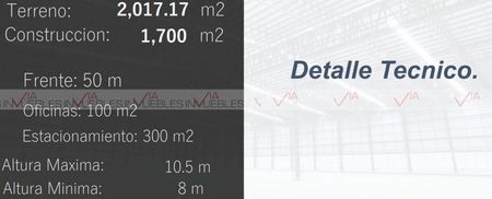 Bodega Industrial en venta en Santa Catarina dentro de parque Industrial, bodega terminada para entregar, terreno de 2,017 m2, con una construcción de 1700 m2 cuenta con rampa y anden con cortina, cubierta lamina calibre 24 con Galvalum y lamina traslucida, pisos de concreto 15 cm, resistencia 250 Fc, altura máxima 10.5m, conexión eléctrica 220 monofasica, ventilación, oficinas terminadas de 100 m2, amplio estacionamiento, calles de 12 m y banquetas de 3m. Conexión a servicios de luz, agua y drenaje. Bodega en PREVENTA , tiempo de entrega de 9 a 12 meses. Id Gvia: 114138