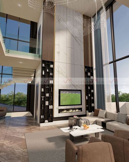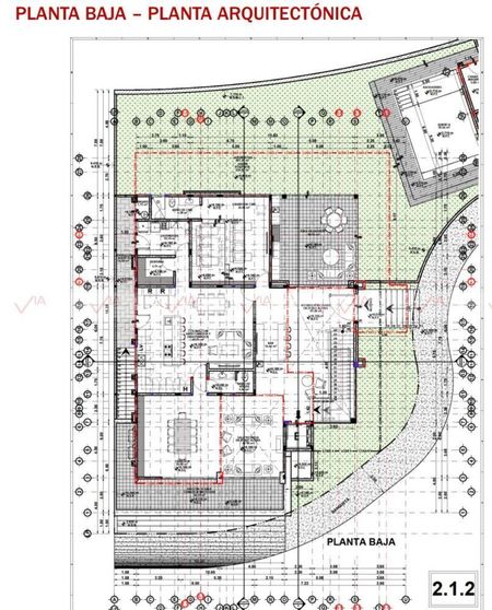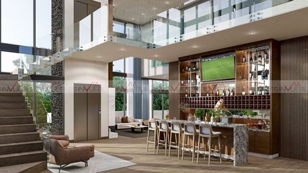 Planta Baja: Acceso con recibidor y bar en doble altura, triple altura en escaleras a planta alta, cubo de elevador, Sala techada en doble altura, comedor con balcón sin techar, baño de visitas, cocina con Family room y antecomedor, despensa, cuarto de lavado, pasillo de servicio, cuarto de cine con opción a recámara con baño completo, terraza techada con barra cubierta de granito con tarja y preparación para asador, baño exterior para área de alberca, jardín exterior con alberca, nicho de equipos, y bodega.