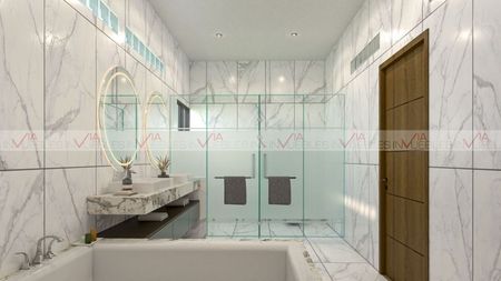Planta Alta: Recámara principal con balcón techado, baño completo con tina de hidromasaje y vestidor walk-in closet en dos niveles. Tres recámaras secundarias, todas con baño completo y vestidor walk- in closet, 2 con balcones, estancia/sala de TV, closet de blancos y sink, cubo de elevador y escalera a rooftop oculta.