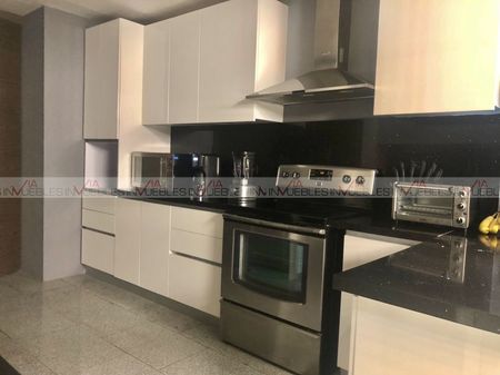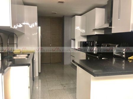 La cocina es abierta y moderna en color blanco y cuenta con muchos gabinetes para guardar, así como una cubierta de granito en tono negro que contrasta y le da un toque muy moderno. Posee 2 amplias recámaras, cada una con su baño completo y clóset vestidor. Cuenta con una estancia localizada entre las recámaras que se puede utilizar como una tercera recámara, ya que cuenta con clóset de pared. El cuarto de lavandería está equipado con lavadora y secadora. Posee cuarto de servicio completo.