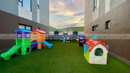 Cuenta con amenidades padrísimas tales como: vita pista, alberca, gym, casa club, asadores, cancha polivalente, dos áreas de juegos infantiles, pet park, etc. El complejo acepta mascotas en el edificio. El complejo tiene 3 torres de departamentos. Y también cada torre cuenta con sus carritos de super.