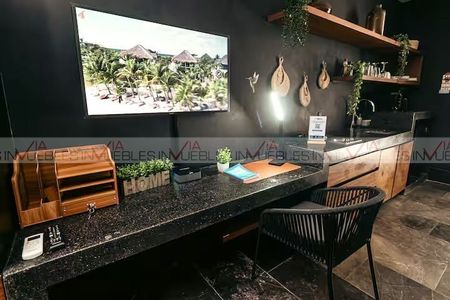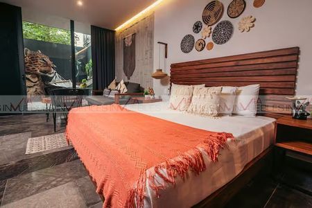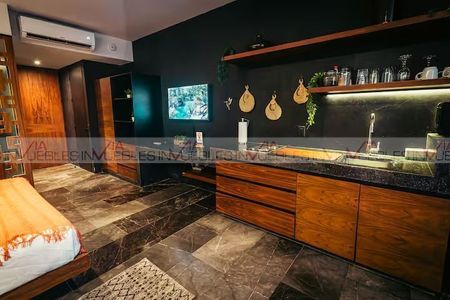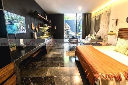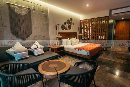 Estudio tipo Loft en Venta, en Tulum, completamente amueblado y equipado actualmente en Airbnb lo cual lo hace excelente opción para inversión a solo 7 minutos de la playa y cerca de algunos de los mejores restaurantes, tiendas y supermercados. Ubicado en Planta Baja, con piscina privada e increíbles amenidades como cenote artificial, jacuzzis y piscina cama tamaño king size, aire acondicionado, cocina americana totalmente equipada, sofá cama y pantalla. Su precio es de $3,800,000 pero cuenta con un BONO DE DESCUENTO DE $300,000