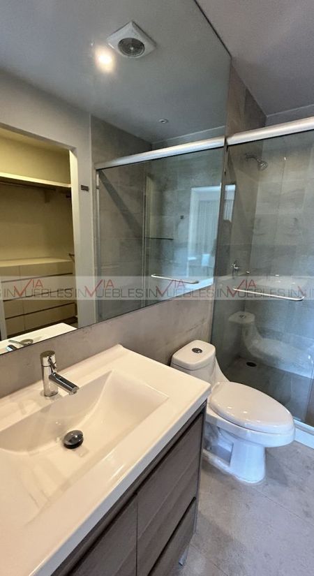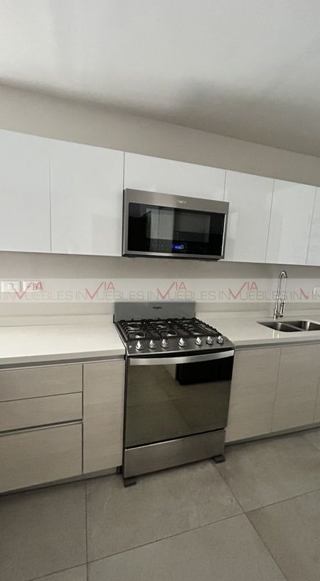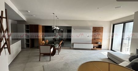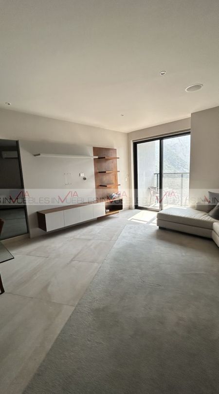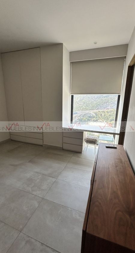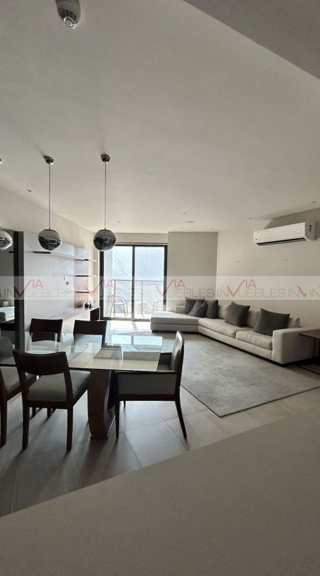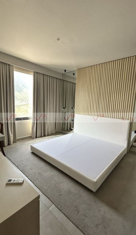 Hermoso departamento estilo contemporáneo, con las mejores vistas de valle poniente, cuenta con cocina totalmente equipada y moderna, mueble para servibar integrado a la sala, mueble para soporte de TV, sala con medidas exactas al tamaña no del departamento, comedor para 6 personas. Tiene una terraza con vista a la huasteca. La recámara principal con mueble empotrado, base de cama, lámparas decorativas, muy amplia, tiene su baño vestidor impecable. La recámara secundaria cuenta con hermoso closet diseñado para el cuarto con un escritorio tocador, su baño completo. El desarrollo cuenta con extraordinarias áreas. Id Gvia: 114604