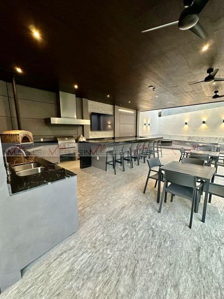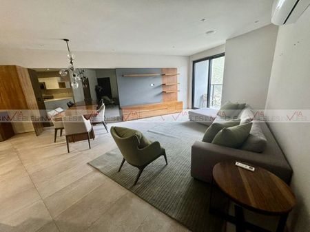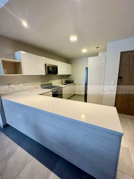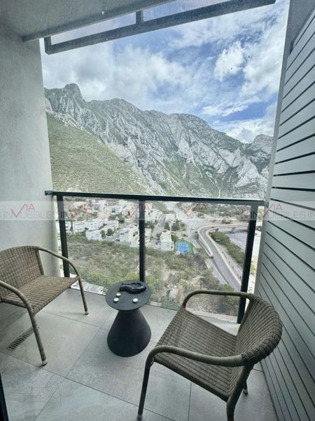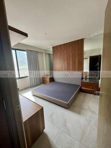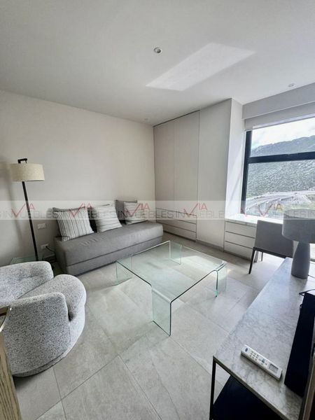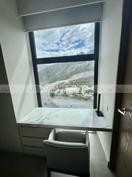 Hermoso departamento estilo contemporáneo, con las mejores vistas de valle poniente, cuenta con cocina totalmente equipada y moderna, mueble para servibar integrado a la sala, mueble para soporte de TV, sala con medidas exactas al tamaña no del departamento, comedor para 6 personas. Tiene una terraza con vista a la huasteca. La recámara principal con mueble empotrado, base de cama, lámparas decorativas, muy amplia, tiene su baño vestidor impecable. La recámara secundaria cuenta con hermoso closet diseñado para el cuarto con un escritorio tocador, su baño completo. El desarrollo cuenta con extraordinarias áreas. Id Gvia: 118585