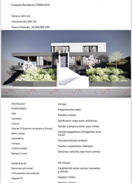 Proyecto Residencial en exclusivo fraccionamiento y Club de Golf Terralta. El proyecto se realizará en un terreno ascendente, el cual cuenta con vistas espectaculares hacia todo el Club, Campo de Golf, cancha de tenis, alberca, palapas, y juegos infantiles. Es un Proyecto de Residencia de dos plantas, Planta Baja: Sala, Comedor, Cocina, Sala de T.V., Baño de visitas, (opción recámara en PB),Terraza, cochera para 3 autos, rampa nivel 1. Planta Alta: Recámara Principal, 2 Recámaras Secundarias, todas con baño completo y walkin closets, Lavandería, Sala de T.V., Terrazas. El Proyecto Incluye: Preparaciones para Paneles Solares, salida para carga de autos eléctricos, salidas y preparaciones para climas, incluye apagadores inteligentes área social, pisos porcelanato de primera, puertas carpinterías interiores, Ventanas sencillas tipo muro cortina. No Incluye: Carpinterías como cocina, lavanetas y closets, equipos de climas, Paneles solares El proyecto puede ser modificado según las necesidades del cliente. Terreno 619m2, construcción 460m2, frente 28m, fondo 25m. Precio Venta $18,900,000. ID 108038 Id Gvia: 108038