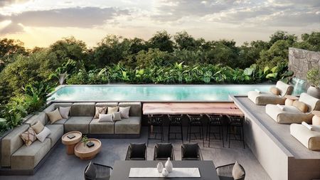 Las residencias son meticulosamente diseñadas para ofrecer vistas impresionantes de la selva maya desde cada apartamento, fusionando la belleza natural con un estilo de vida moderno y sostenible. Cada hogar, ya sea un apartamento de una sola habitación o un lujoso ático, cuenta con una terraza para disfrutar de la serenidad diaria de vivir rodeado de naturaleza.