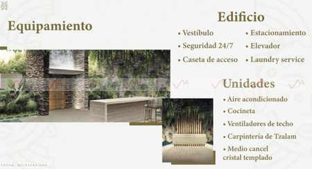 Venta de departamentos en Tulum, ubicados en un complejo residencial con todas las comodidades. Este hermoso departamentos de 1 y 2 recámaras con baño completo cuenta con 1 cajón de estacionamiento, edificio de 3 plantas cuenta con vestibulo, seguridad 24/7, caseta de acceso, estacionamiento, elevador y laundry service.