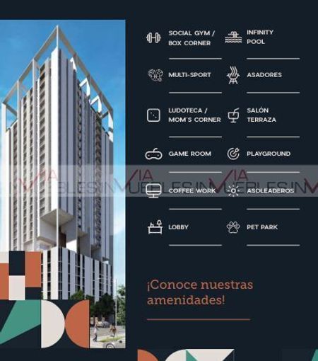 La torre de departamentos con 28 pisos totales, cuenta con amenidades tales como, alberca, ludoteca, gimnasio, cowork, pet park, game room, social room, yoga, asoleadores, asadores, lobby entre otras. Así mismo encontrarás comercio en la parte baja del edificio. Con fáciles vías de acceso.