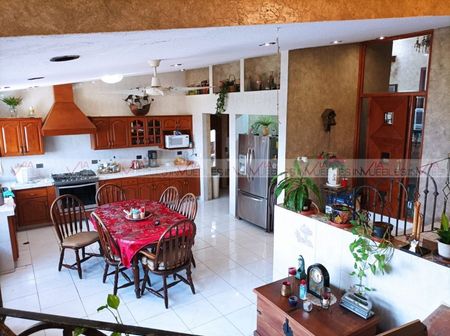 Primer Nivel: Entrada principal que da acceso al recibidor con hermosos vitrales, oficina privada, amplia sala comedor con ventanales que ofrecen una magnífica vista de la ciudad, bar y espacio decorativo, amplia cocina en espacio abierto con sala de estar, que la hace especial y acogedora, permitiendo que sea un lugar en donde se pueda reunir toda la familia para cocinar, convivir y ver eventos televisivos o deportivos, además cuenta con cuarto de alacena. La cocina tiene salida a la cochera para tres autos, pudiendo estacionar más autos en los 25 metros de frente de la casa, lo cual resulta genial en caso de reuniones sociales. Y acceso a pasillo con escalera que lleva al área social y alberca.
