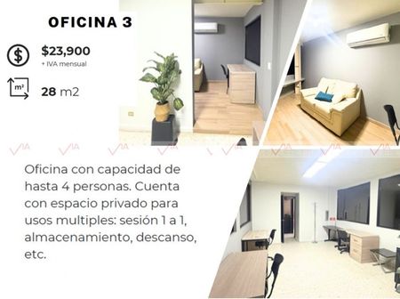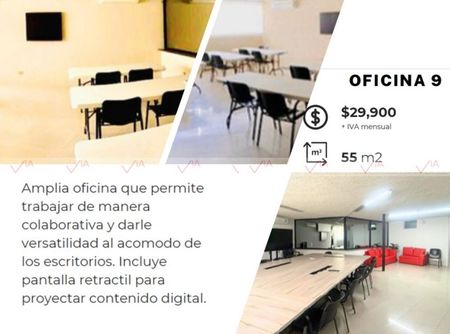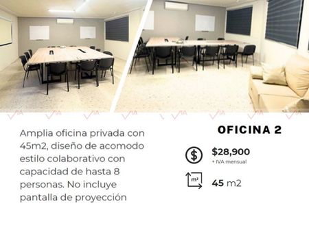 Elige la oficina privada que más se adapte a tus necesidades y disfruta de amenidades compartidas en un ambiente tipo coworking: recepción, sala de juntas, cocineta, baños y área al aire libre.
