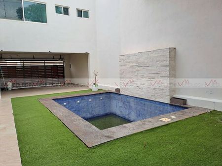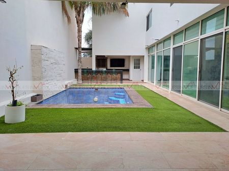 En planta baja y con espacios muy amplios y abiertos se localiza el recibidor, sala, comedor, cocina equipada, medio baño de visitas, cochera para dos vehículos, cuarto de servicio con baño completo y un hermoso patio con área de asador y alberca con cascada.