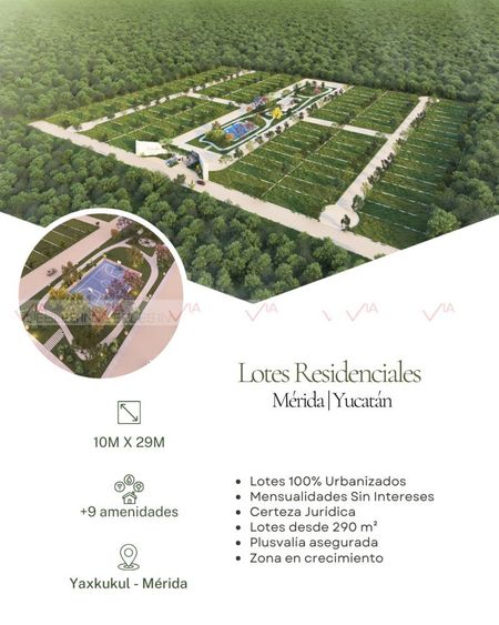 Lotes residenciales en Mérida, los cuales contarán con barda perimetral, banquetas, mojoneras naturales, fachada, control de acceso, calles blancas, iluminación inteligente. 110 lotes residenciales con 5,152 m² de áreas verdes. Lote promedio desde 290 m² hasta 397.79 m².