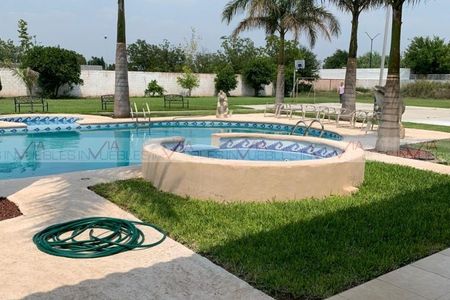 El jardín cuenta con una alberca, acompañada de un cuarto de bombas, una terraza equipada con asador, barra de granito y un medio baño adicional.